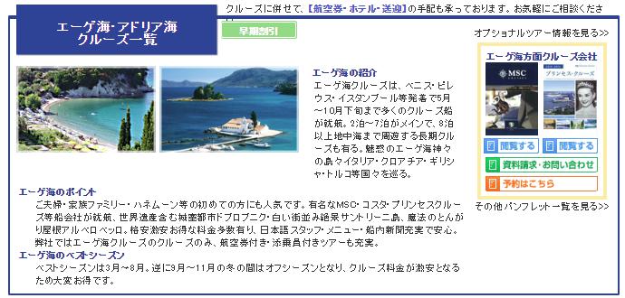 ご夫婦・家族ファミリー・ハネムーン等の初めての方にも人気です。有名なMSC・コスタ・プリンセスクルーズ等船会社が就航、世界遺産含む城塞都市ドブロブニク・白い街並み絶景サントリーニ島、魔法のとんがり屋根アルベロベッロ。格安激安お得な料金多数有り、日本語スタッフ・メニュー・船内新聞充実で安心。弊社ではエーゲ海クルーズのクルーズのみ、航空券付き・添乗員付きツアーも充実しております。