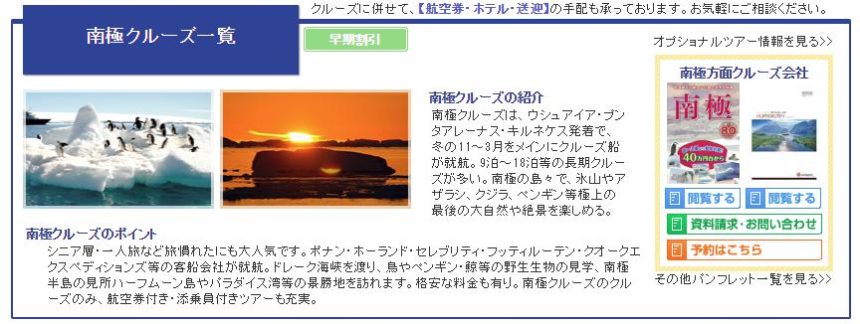 シニア層・一人旅など旅慣れたにも大人気です。ポナン・ホーランド・セレブリティ・フッティルーテン・クオークエクスぺディションズ等の客船会社が就航。ドレーク海峡を渡り、鳥やペンギン・鯨等の野生生物の見学、南極半島の見所ハーフムーン島やパラダイス湾等の景勝地を訪れます。格安な料金も有り。南極クルーズのクルーズのみ、航空券付き・添乗員付きツアーも充実です。