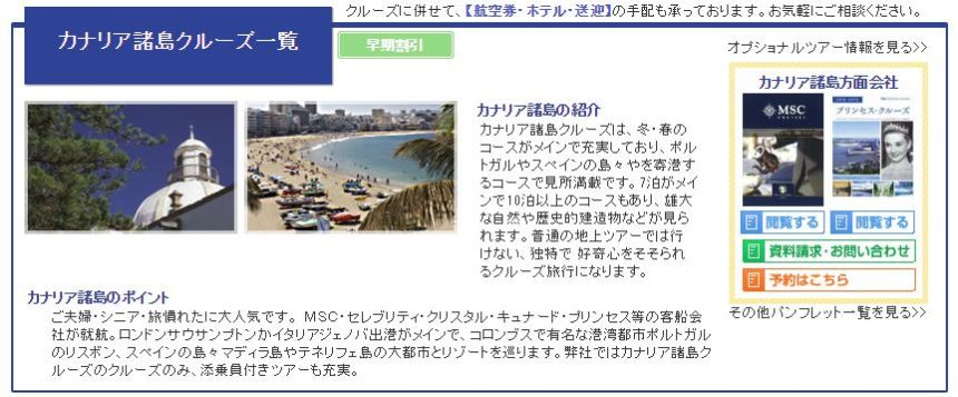 ご夫婦・シニア・旅慣れたに大人気です。 MSC・セレブリティ・クリスタル・キュナード・プリンセス等の客船会社が就航。ロンドンサウサンプトンかイタリアジェノバ出港がメインで、コロンブスで有名な港湾都市ポルトガルのリスボン、スペインの島々マディラ島やテネリフェ島の大都市とリゾートを巡ります。弊社ではカナリア諸島クルーズのクルーズのみ、添乗員付きツアーも充実です。