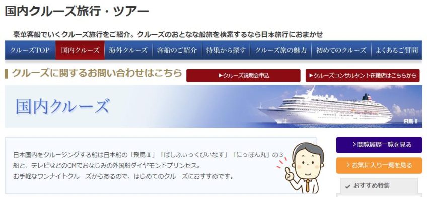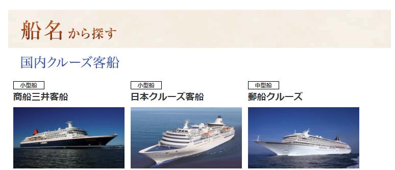 日本国内をクルージングする船は日本船の「飛鳥Ⅱ」「ぱしふぃっくびいなす」「にっぽん丸」の3船と、テレビなどのCMでおなじみの外国船ダイヤモンドプリンセス。