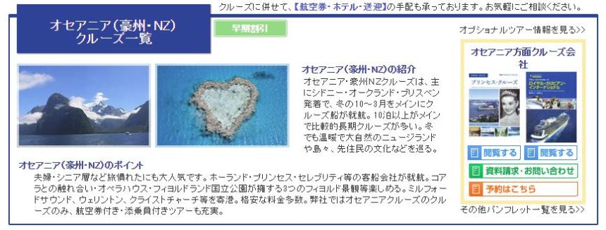 夫婦・シニア層など旅慣れたにも大人気です。ホーランド・プリンセス・セレブリティ等の客船会社が就航します。コアラとの触れ合い・オペラハウス・フィヨルドランド国立公園が擁する3つのフィヨルド景観等楽しめます。ミルフォードサウンド、ウェリントン、クライストチャーチ等を寄港。格安な料金多数。弊社ではオセアニアクルーズのクルーズのみ、航空券付き・添乗員付きツアーも充実です。