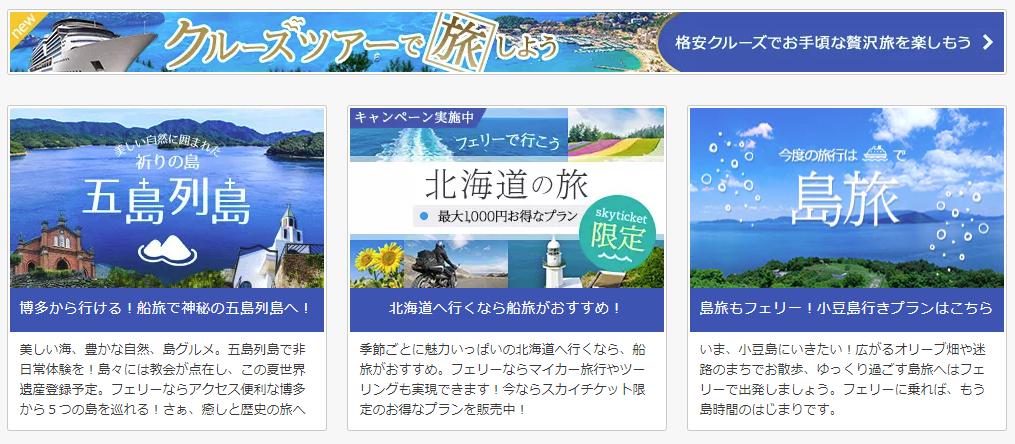スカイチケットの格安フェリー予約では3つの特徴があります。スカイチケットではフェリー乗車券と水族館やゴルフ場などのアクティビティが一緒になったオリジナルプランもご用意!旅行先で訪れる場所が決まっている方は、このセットプランで手間も省けてさらにお得に。また、スカイチケットでしか予約できないフェリー会社も。ぜひ、フェリー旅行を検討の方はスカイチケットのプランを一度確認してみて下さい
